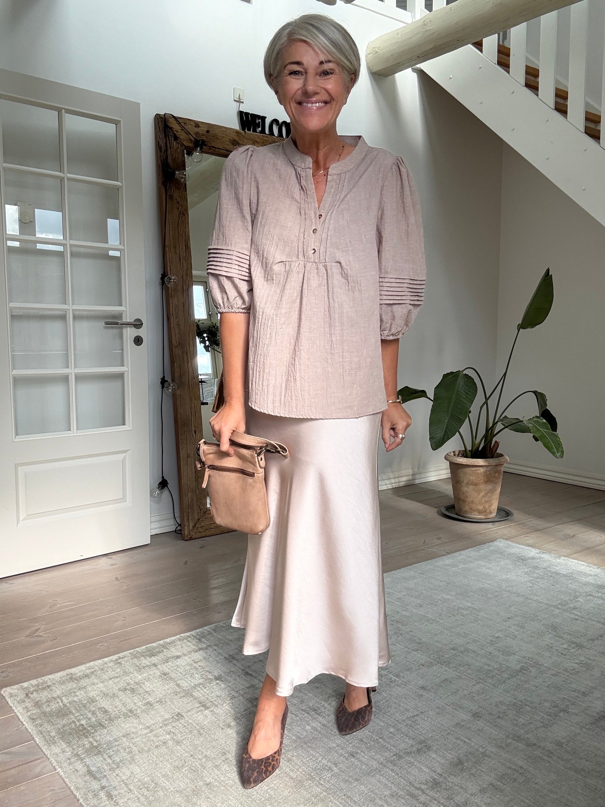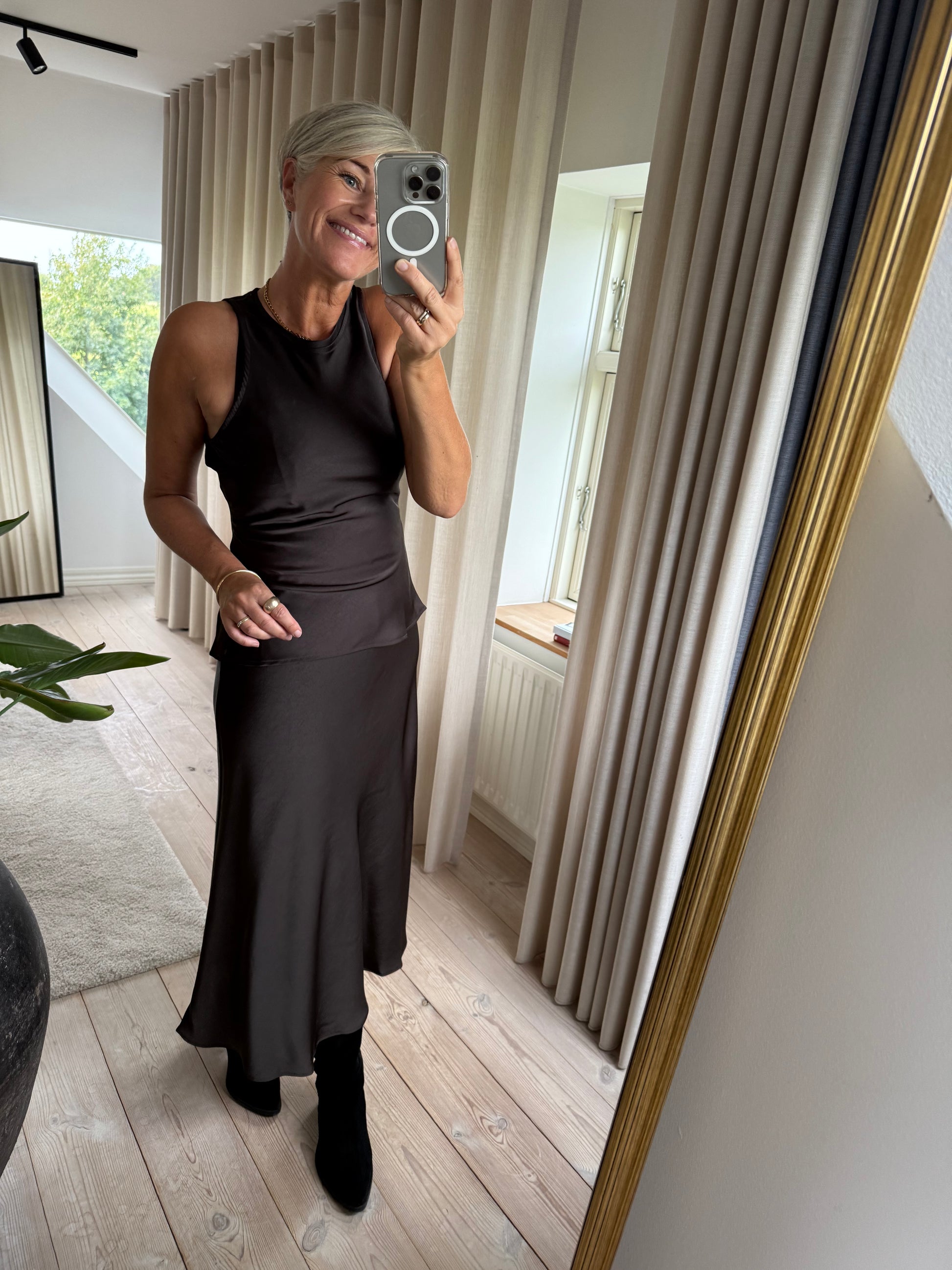 Fin nederdel med elastik indvendigt i taljen fra Neo Noir. Nederdelen er skåret på skrå, følger kroppen og falder smukt. Kvaliteten er en lækker blød satin.