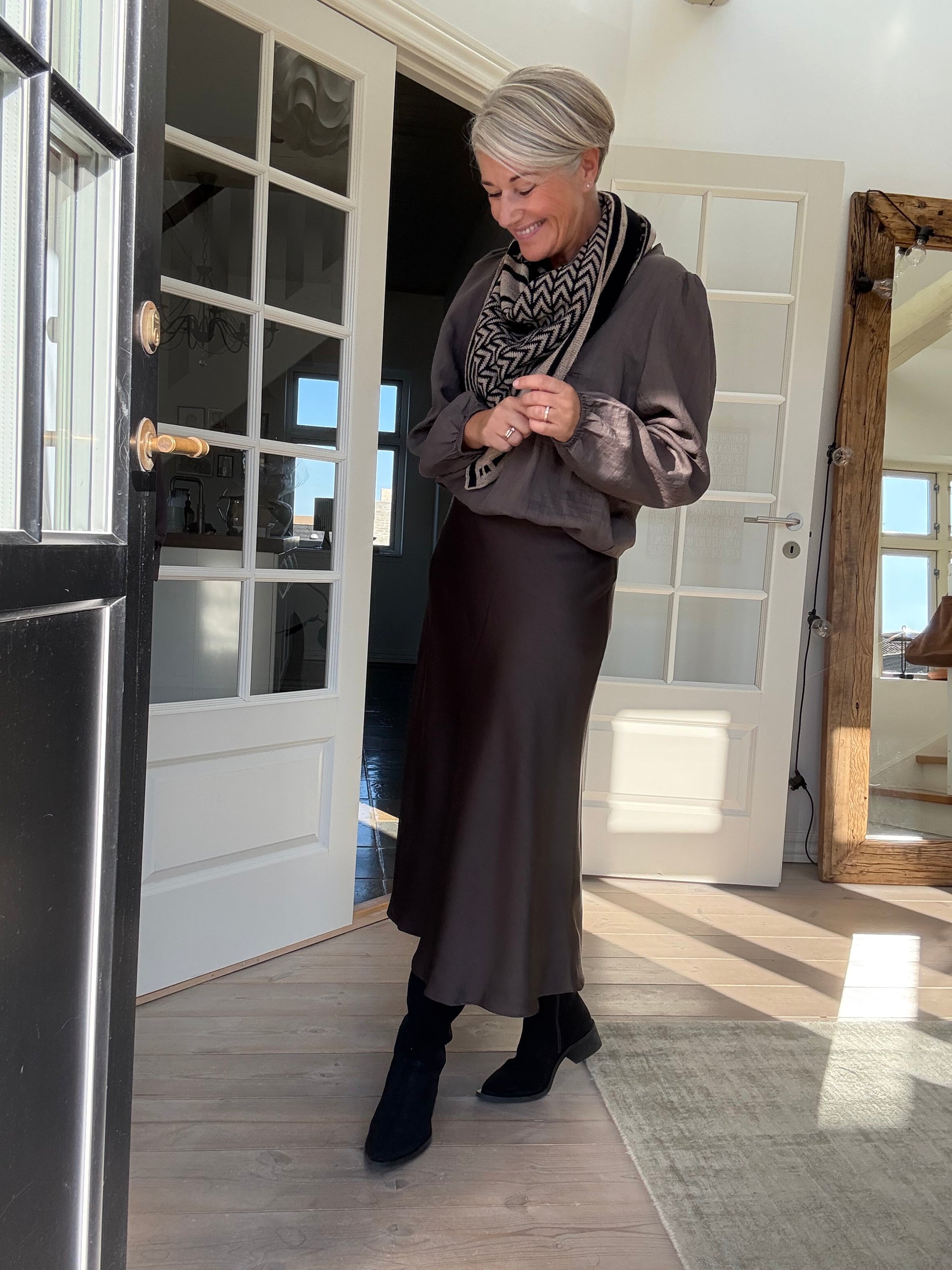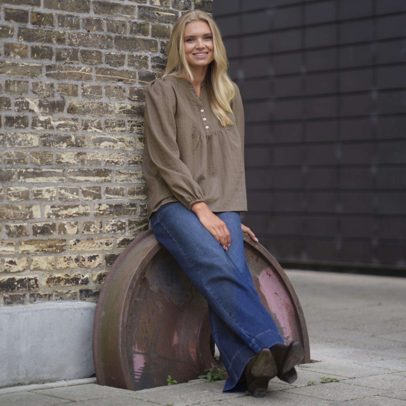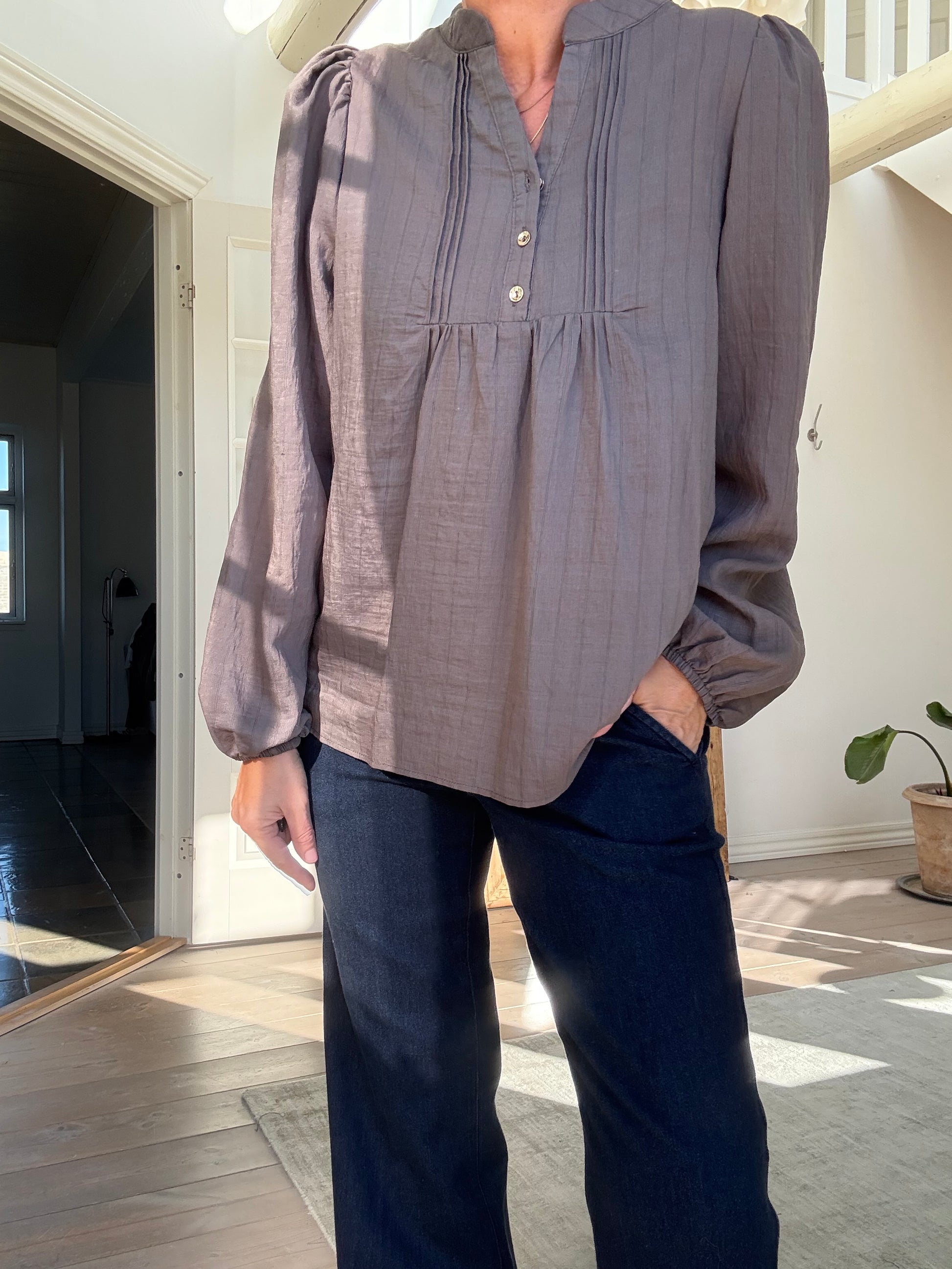 Camilla blusen har v-hals med 3 knapper ned foran og fine feminine læg ved brystet, lange ærmer med elastik ved håndleddet og et let puffede skuldre med fine rynkedetaljerer.