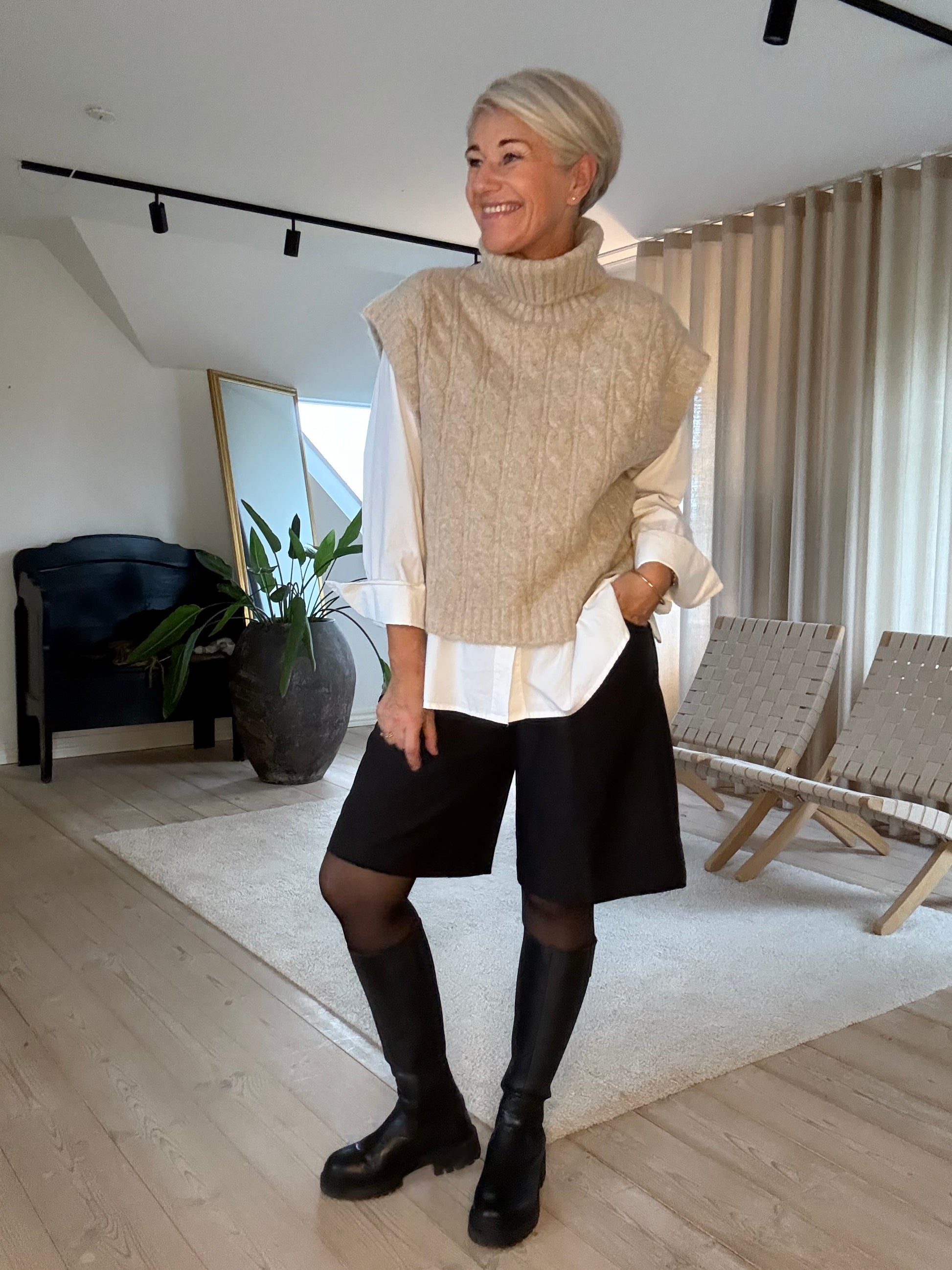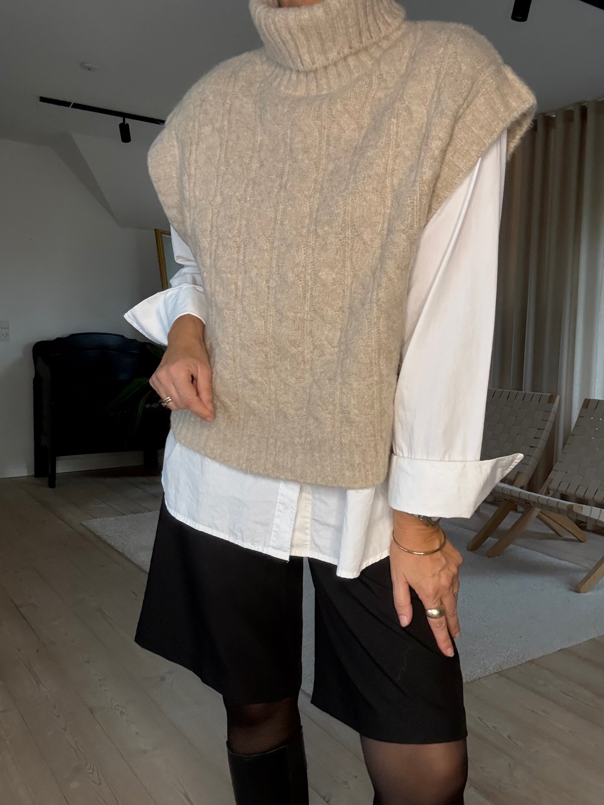 FresnoLL vesten er en blød strik med klassisk kabelmønster og høj hals. Og har en løs pasform med ribkant forneden og ved ærmegabene. Den perfekte tilføjelse til lag-på-lag looks i efteråret.