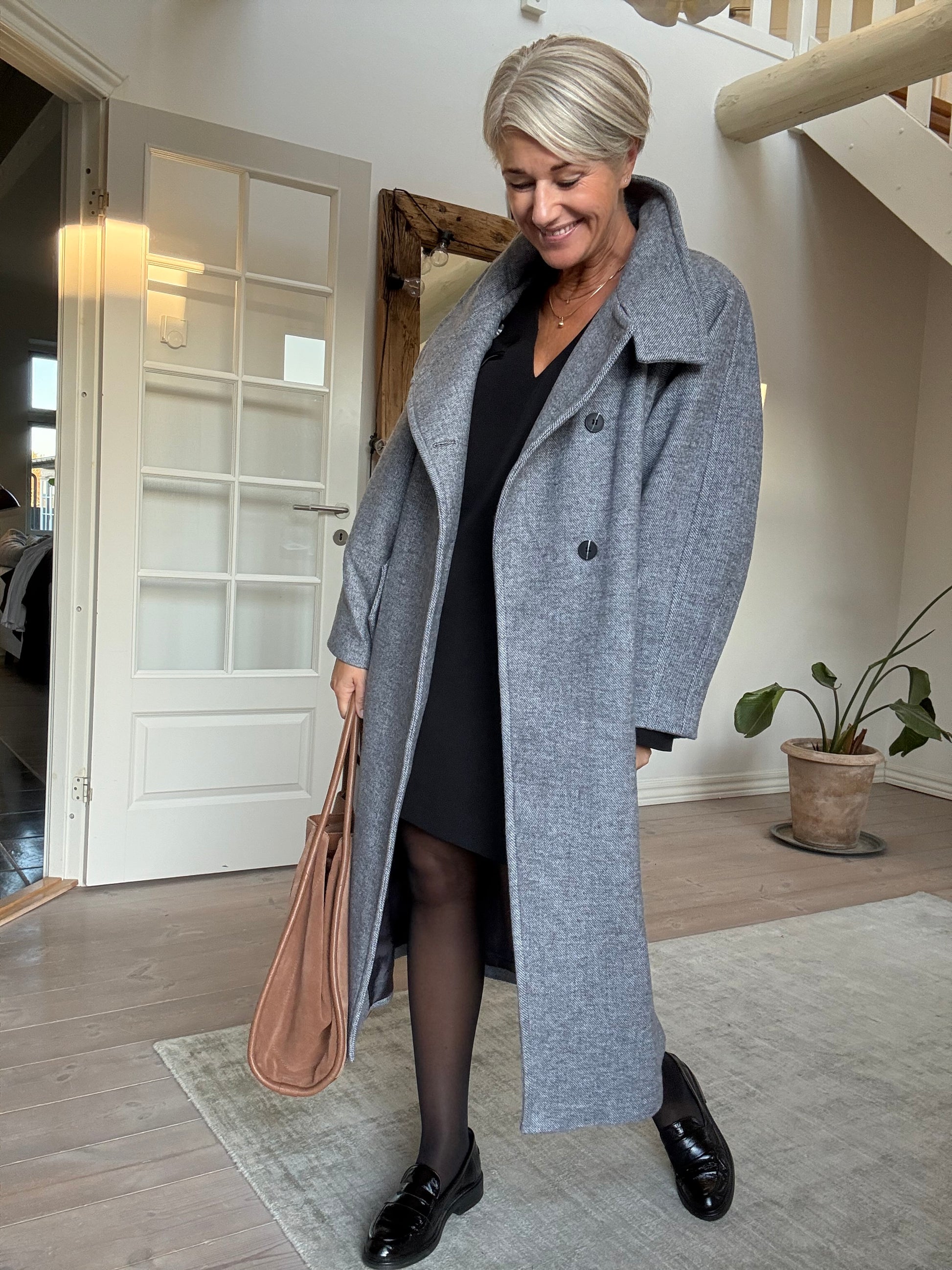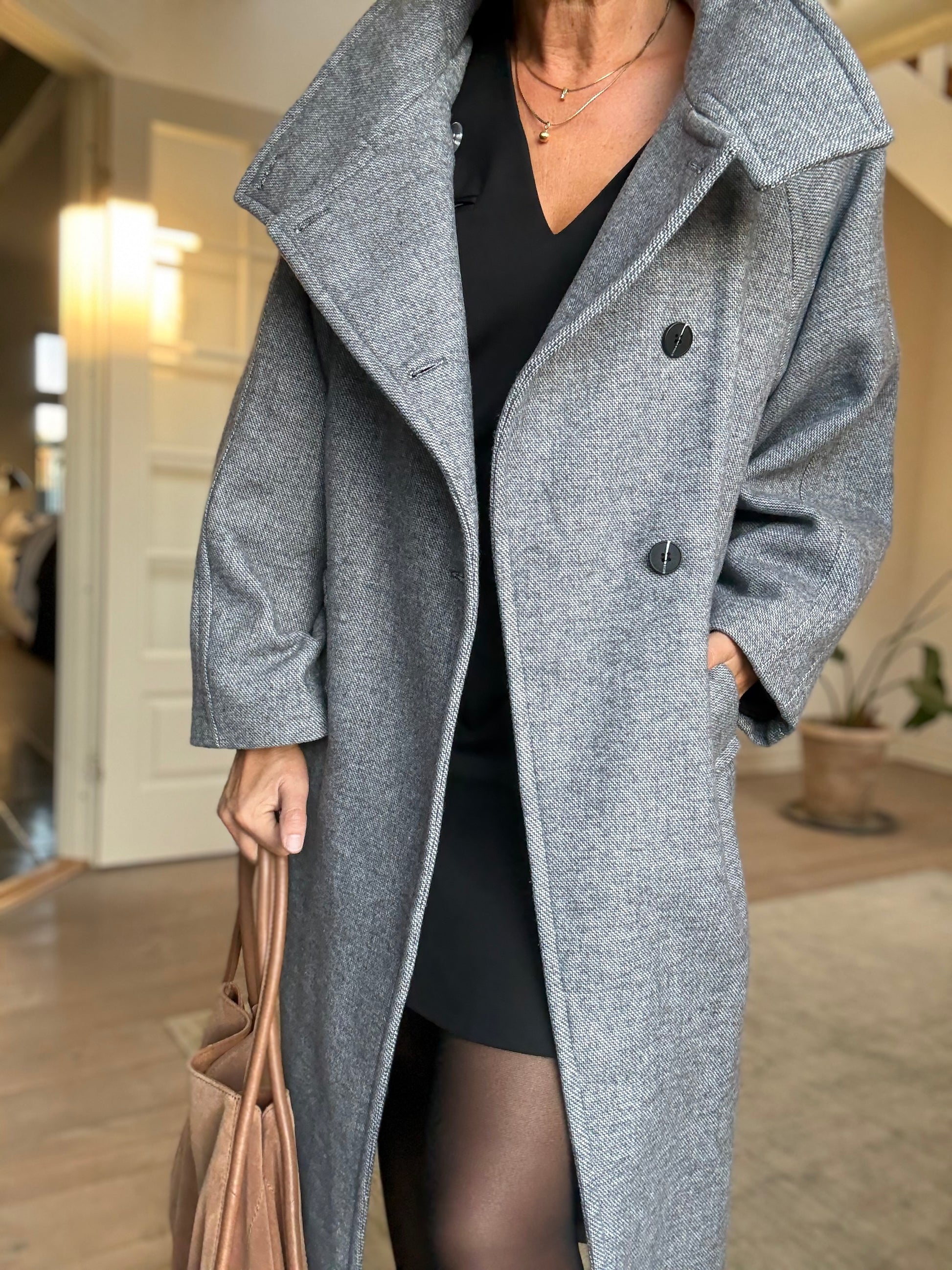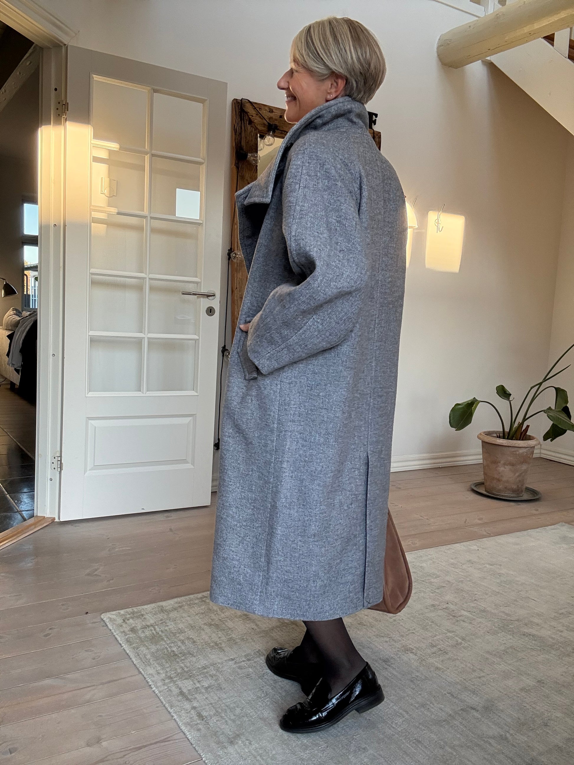 Lækker frakke fra Ichi. Fås i den flotteste lysegrå farve. Den har bindebånd og er ret oversized