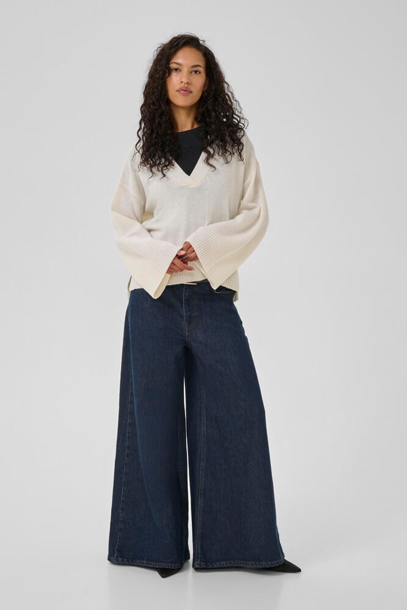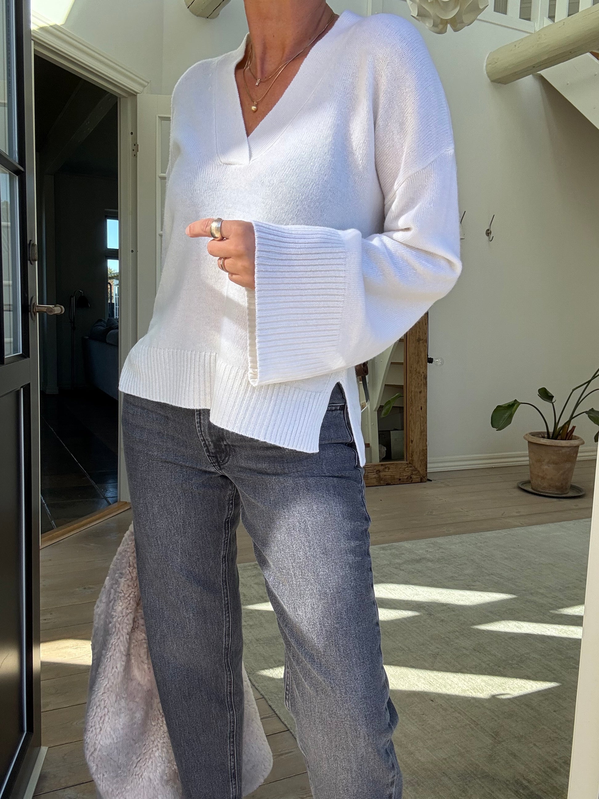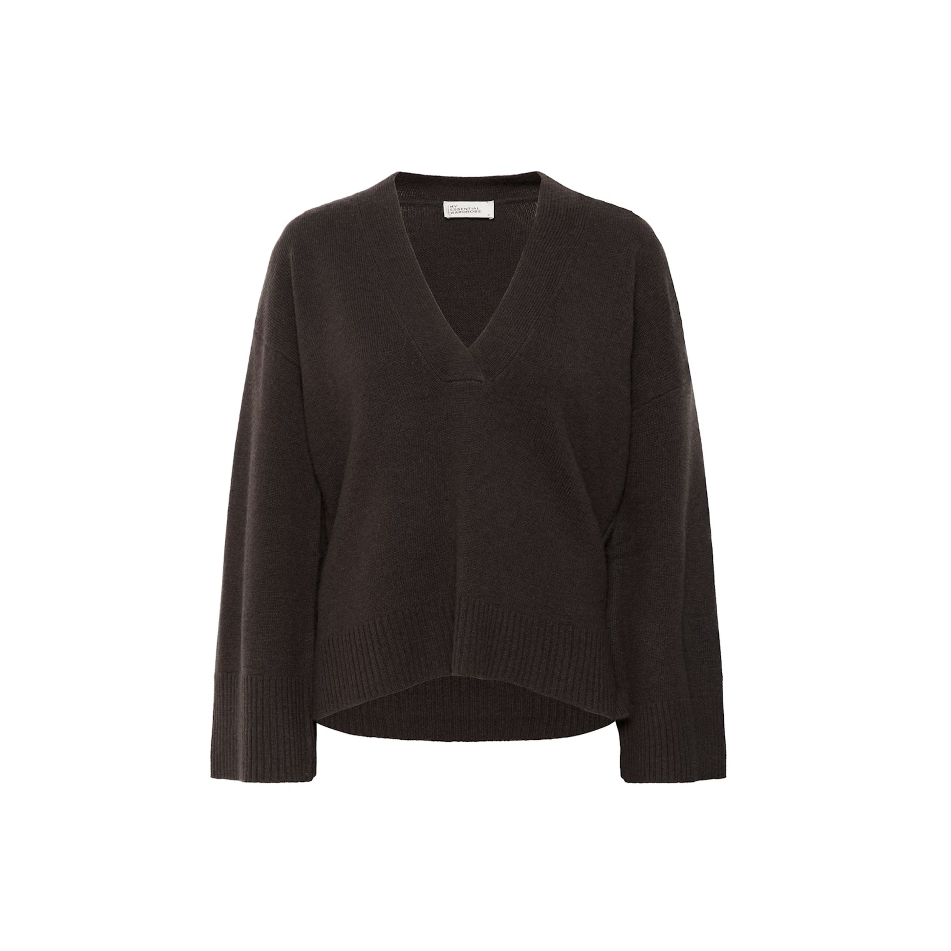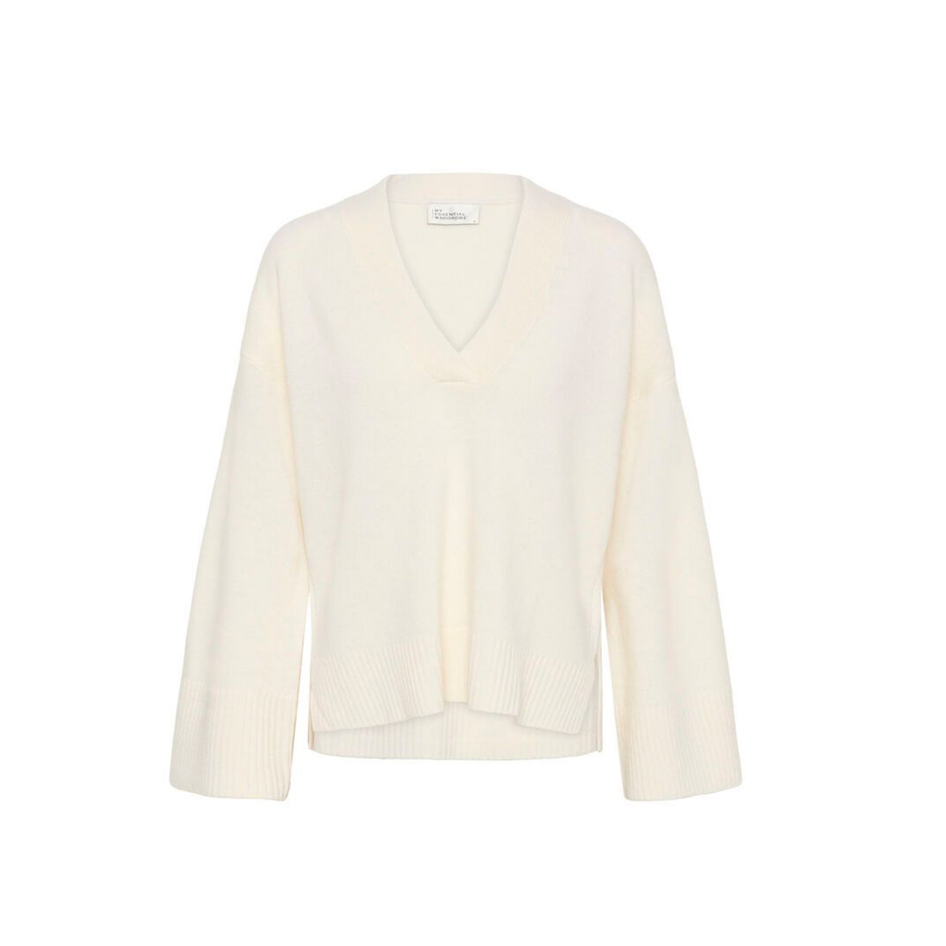 Denne V-udskårne sweater har en afslappet pasform og moderne silhuet med brede ærmer og ribkanter. Komfortabel og alsidig til både lag-på-lag og hverdagsbrug.