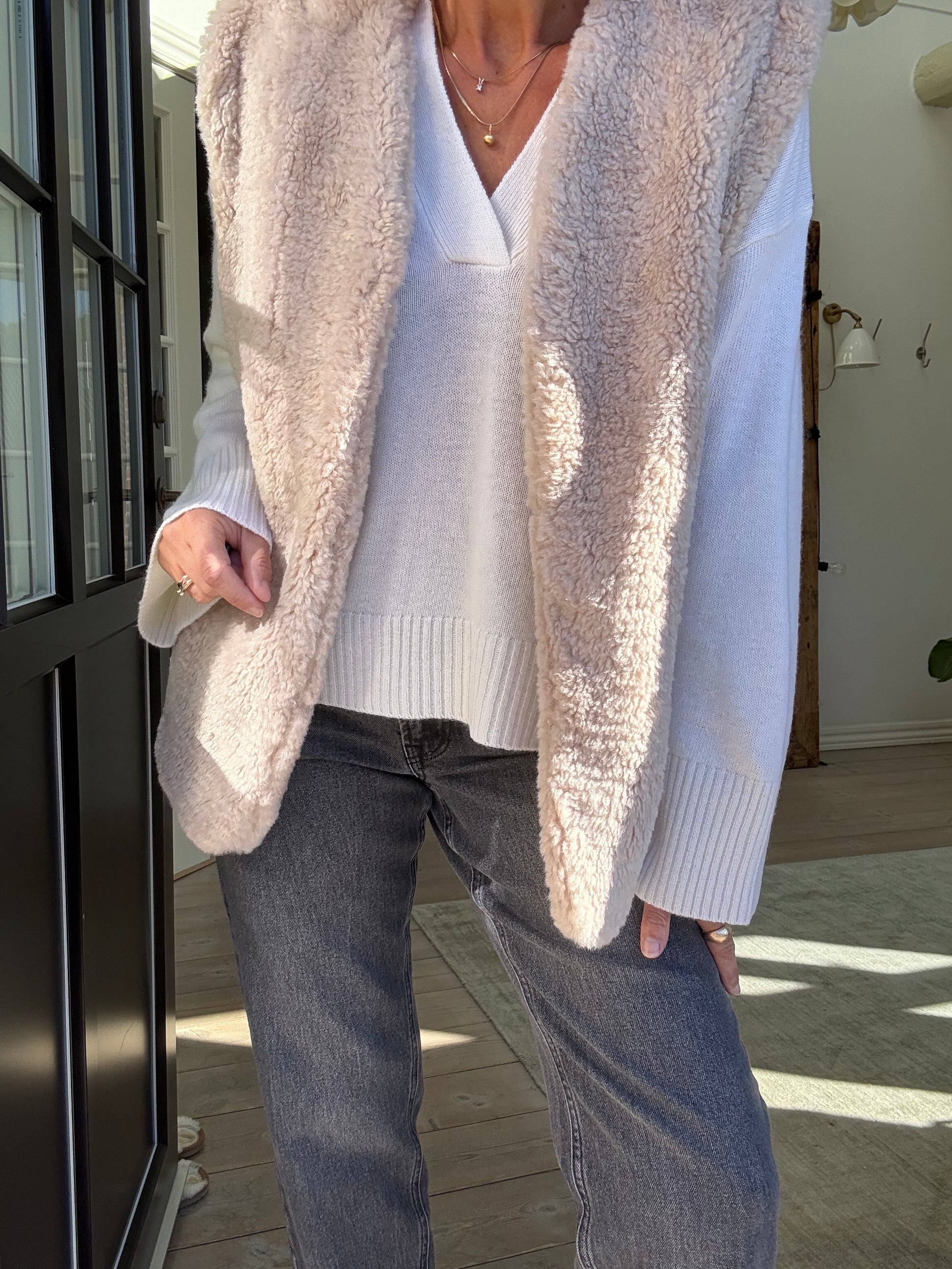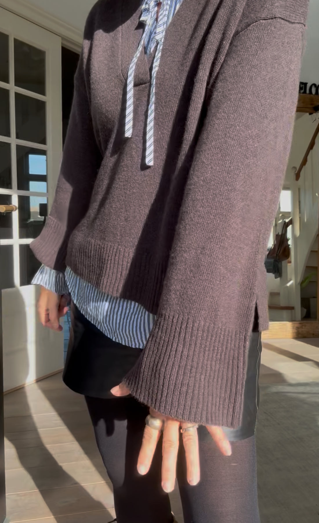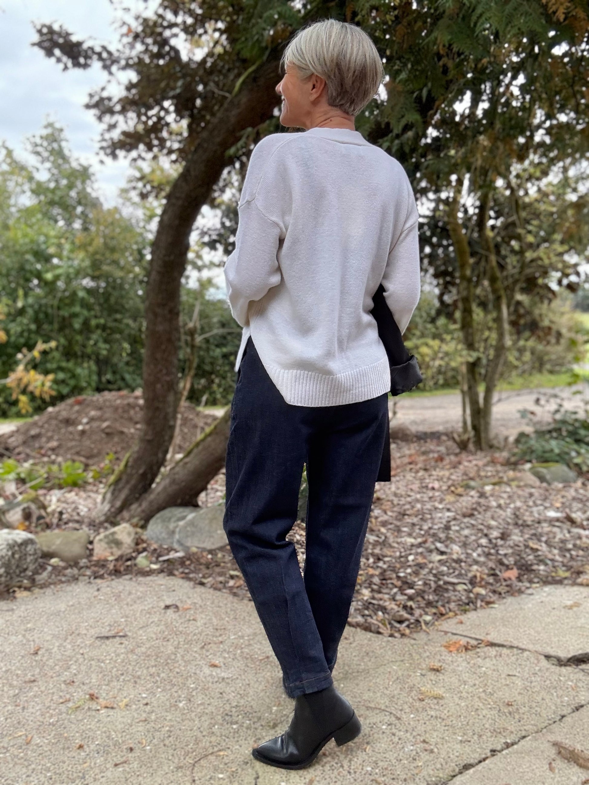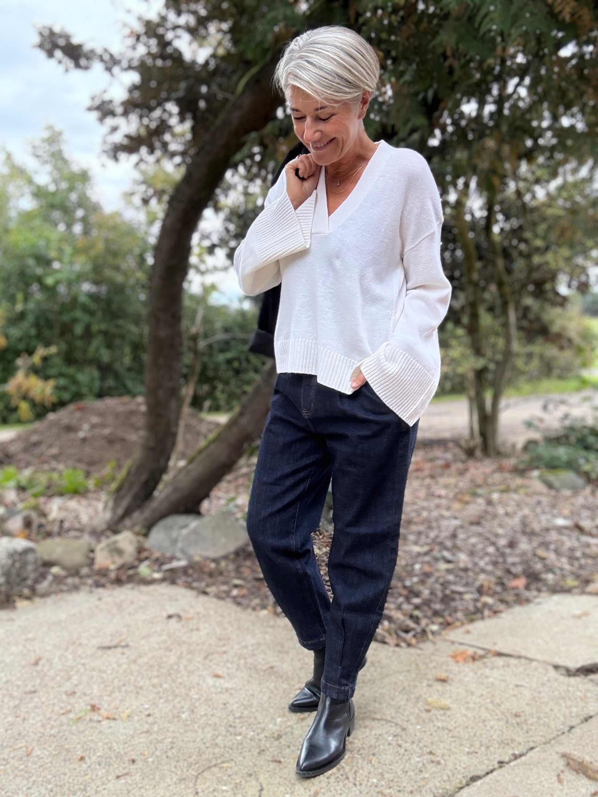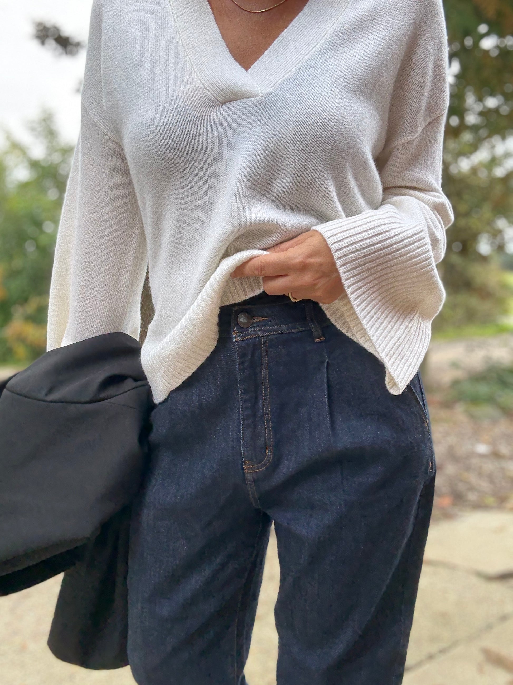 Denne V-udskårne sweater har en afslappet pasform og moderne silhuet med brede ærmer og ribkanter. Komfortabel og alsidig til både lag-på-lag og hverdagsbrug.