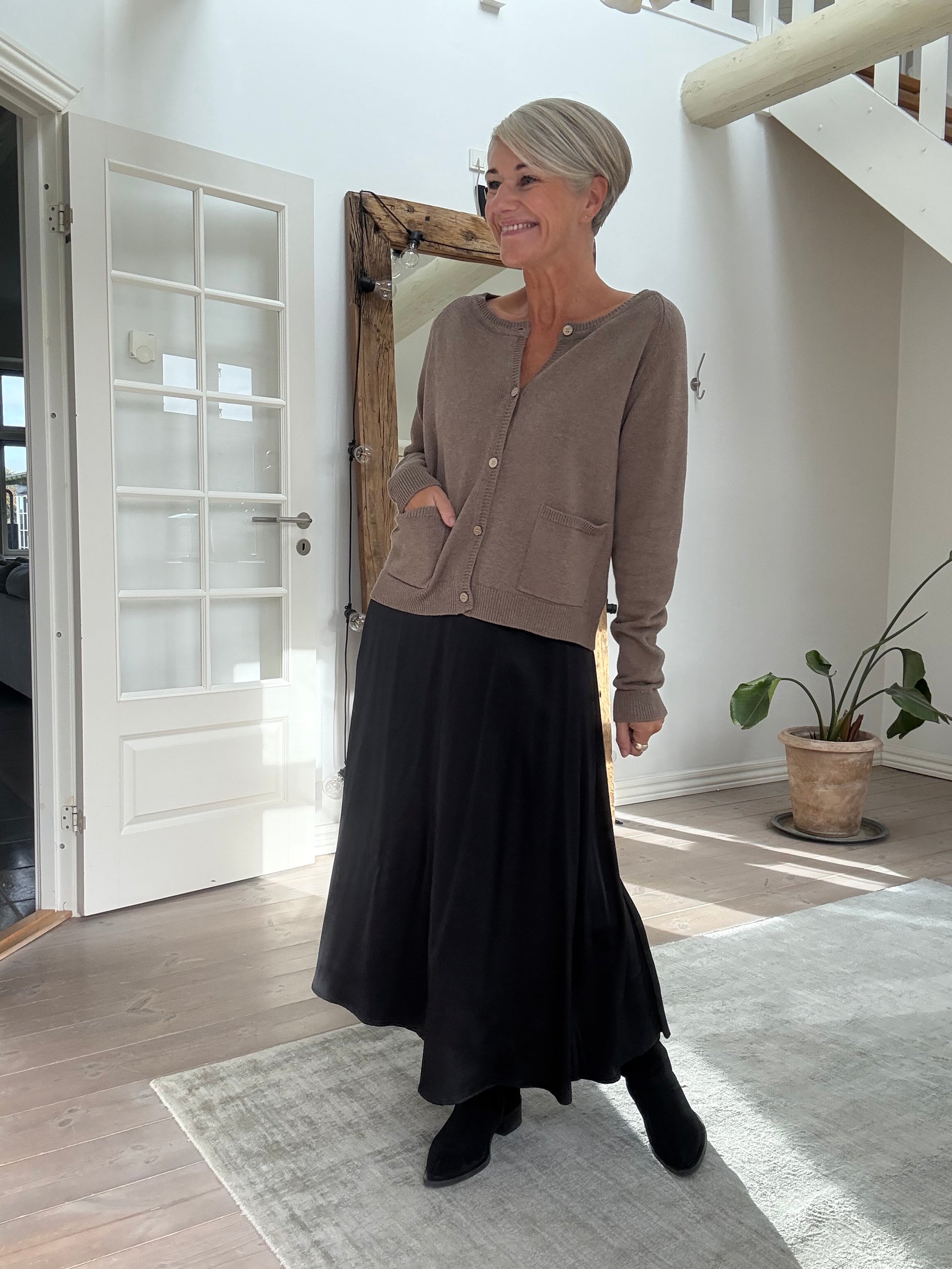 Lelou cardiganen er i 100% bomuld og har de smukkeste detaljer. Cardiganen er en klassisk, natur brun striktrøje med rund hals og lange ærmer. Den har en front med gennemgående knaplukning og to påsyede lommer foran. Ribkanter ved hals, ærmer og bund giver et afslappet og tidløst udtryk. Perfekt til lag-på-lag-styling i hverdagen.