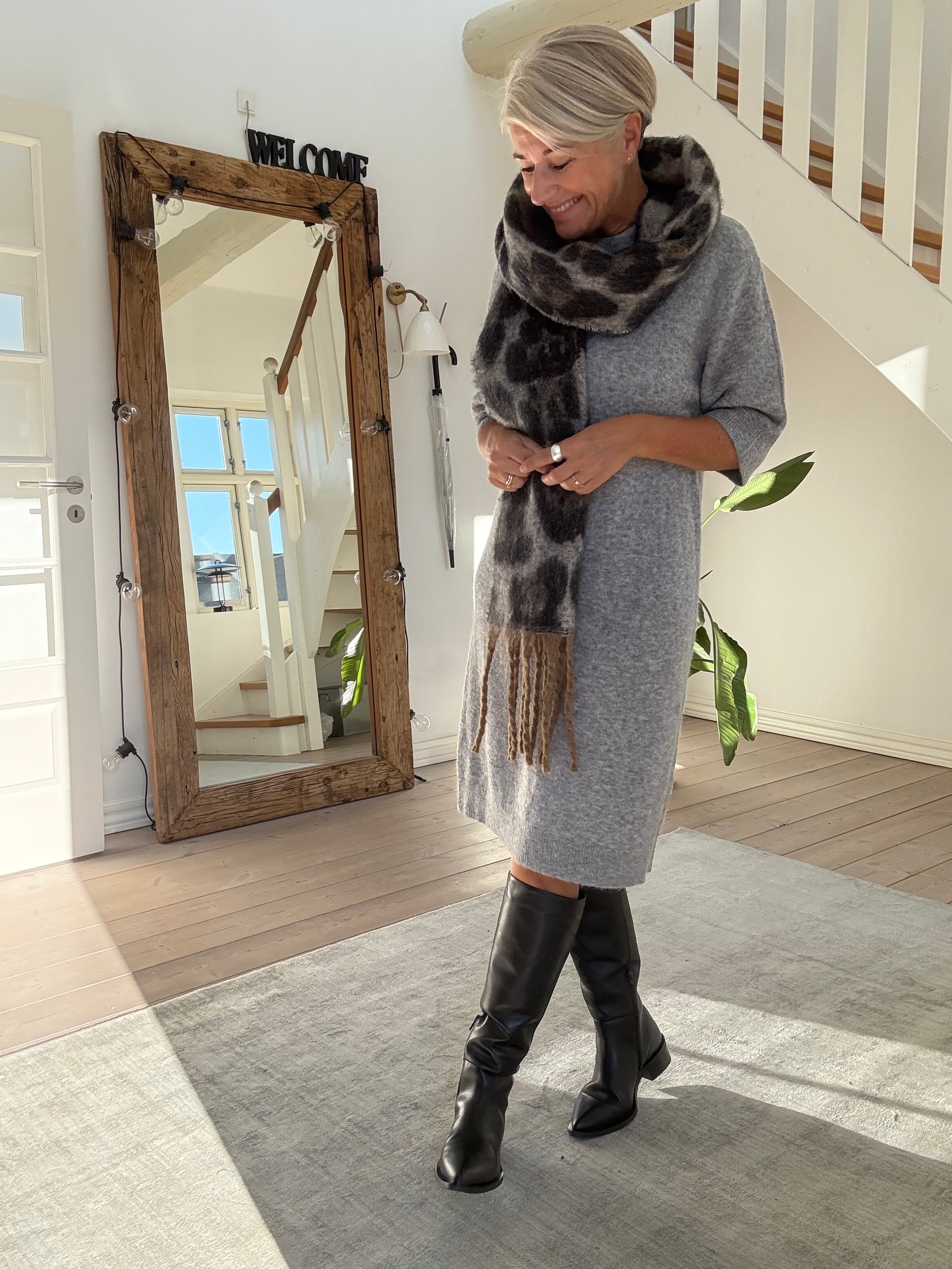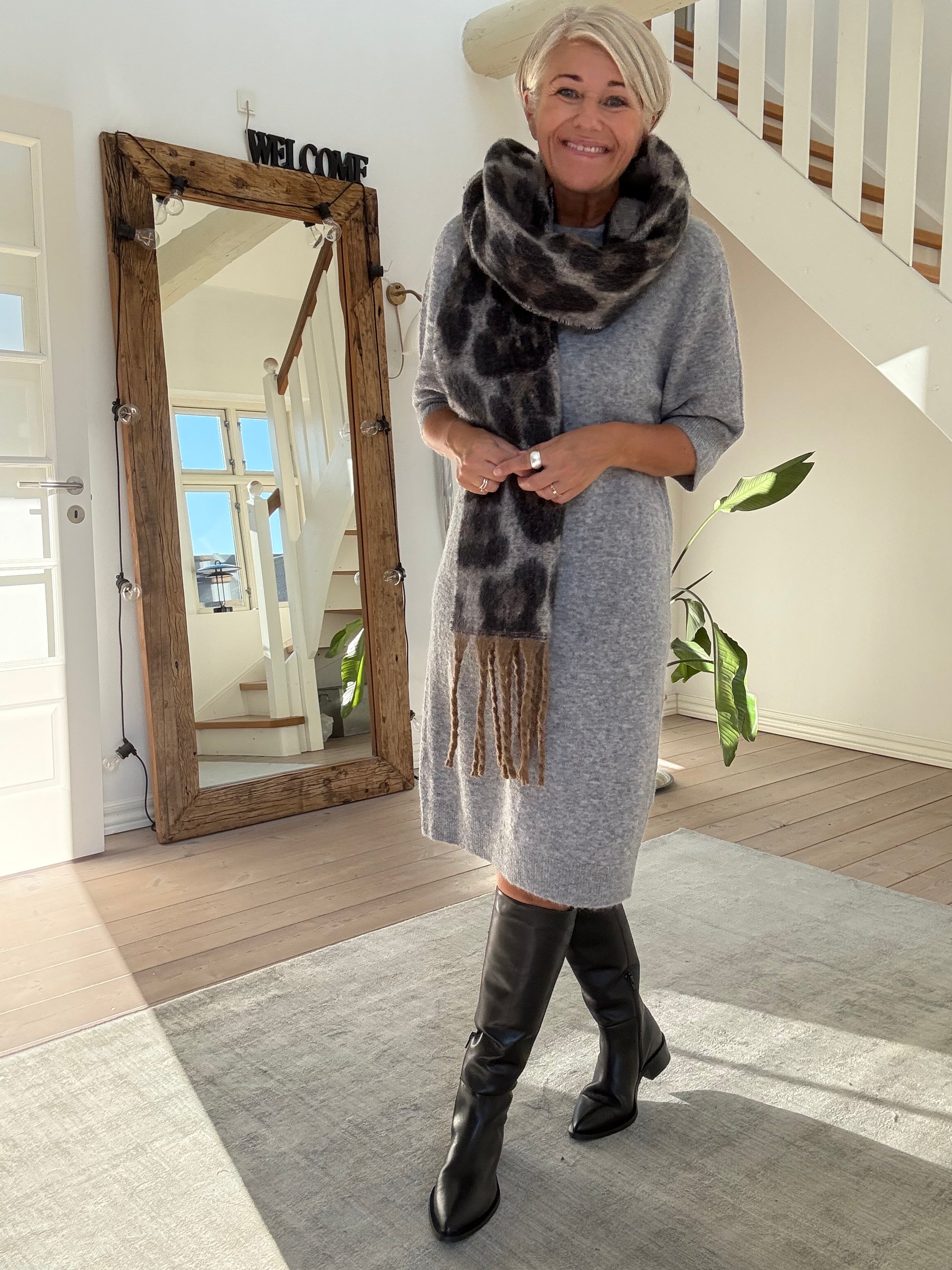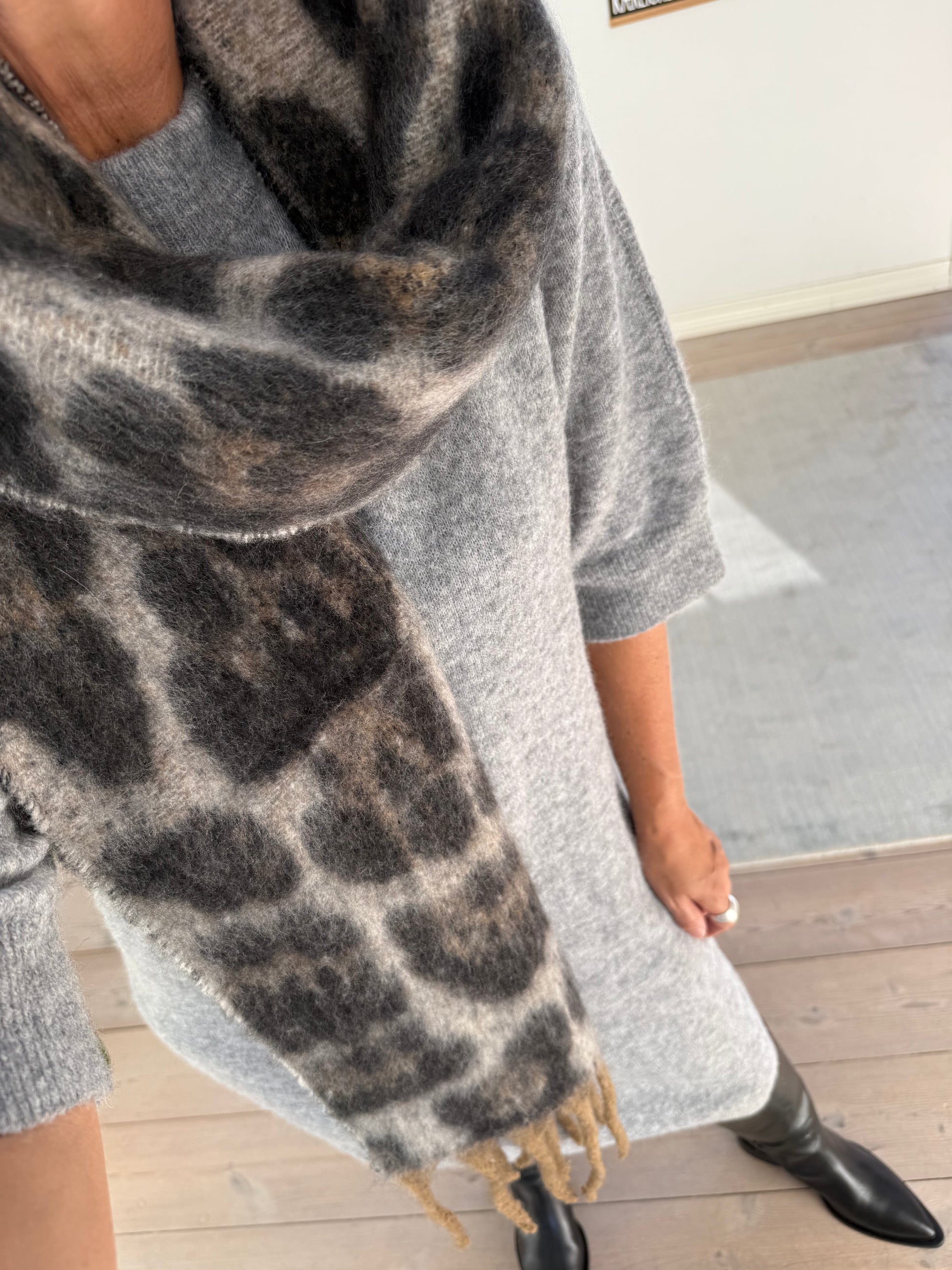 Lækkert aflangt tørklæde i brune nuancer.