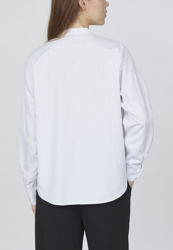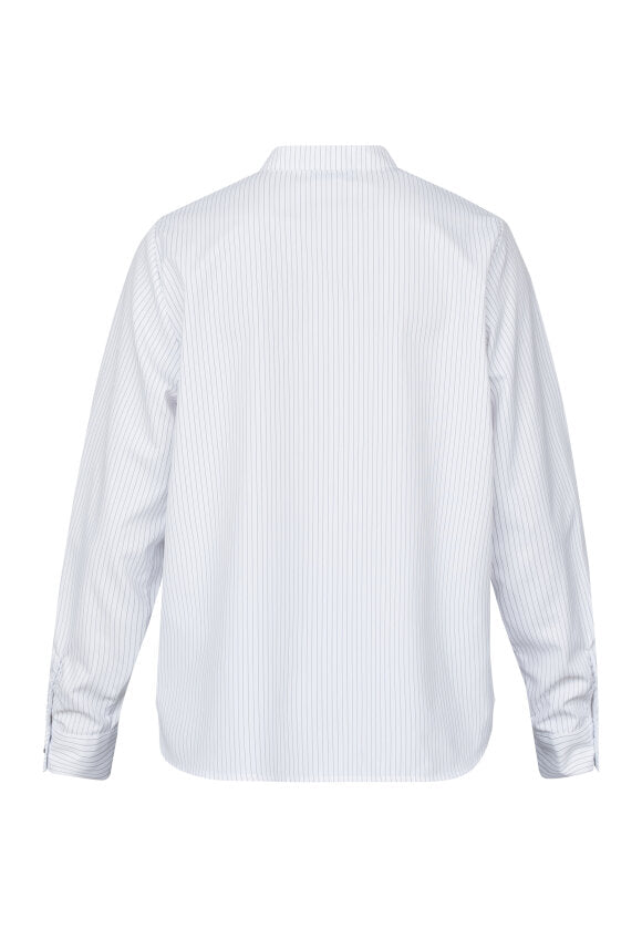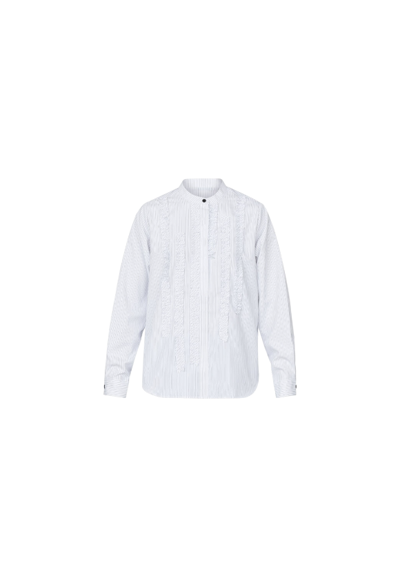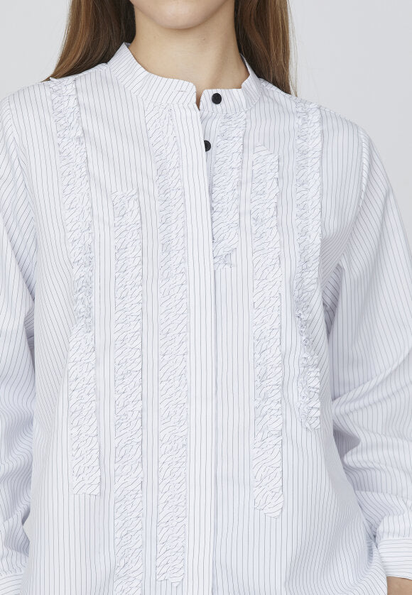 love1268 er en cool stribet skjorte med lange ærmer. skjorten har rund hals og er detaljeret med små striber med flæser.