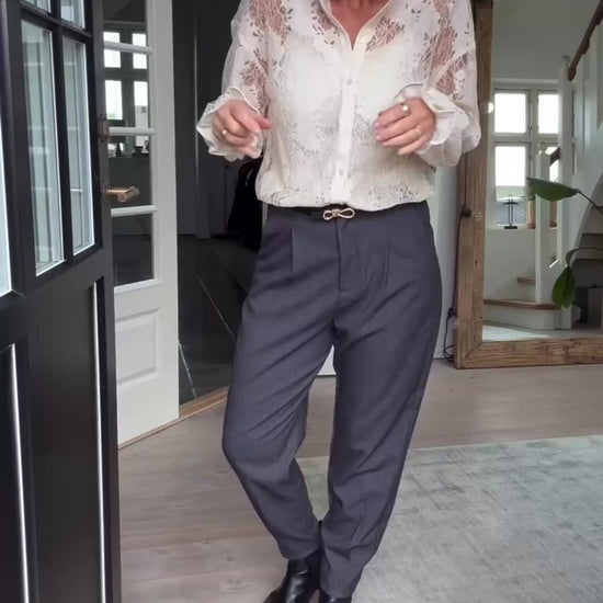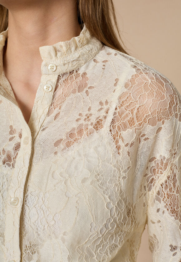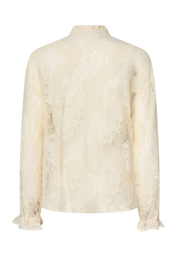 Love1470 er en langærmet skjortebluse i blomstret blonde med en gennemgående knaplukning og en flæsekantet krave. ærmerne har manchetter med flæsedetaljer.