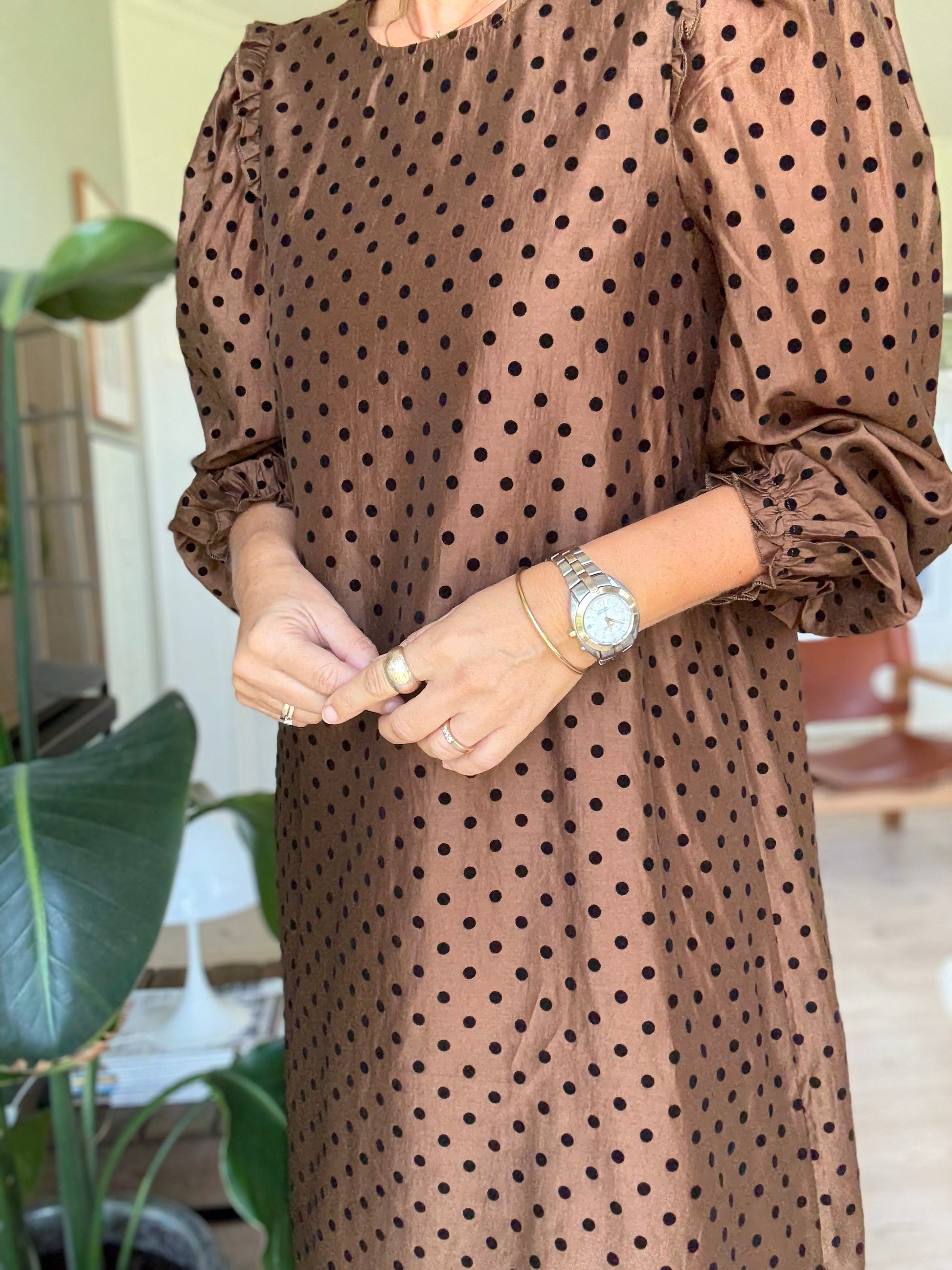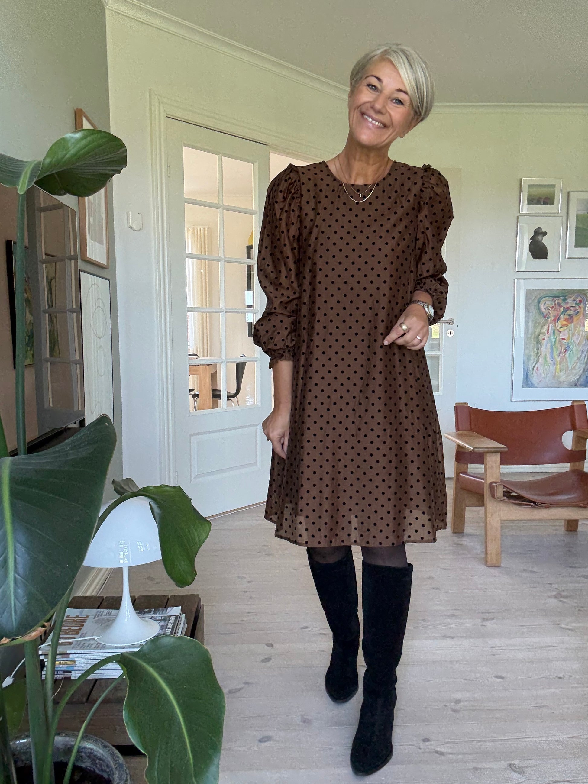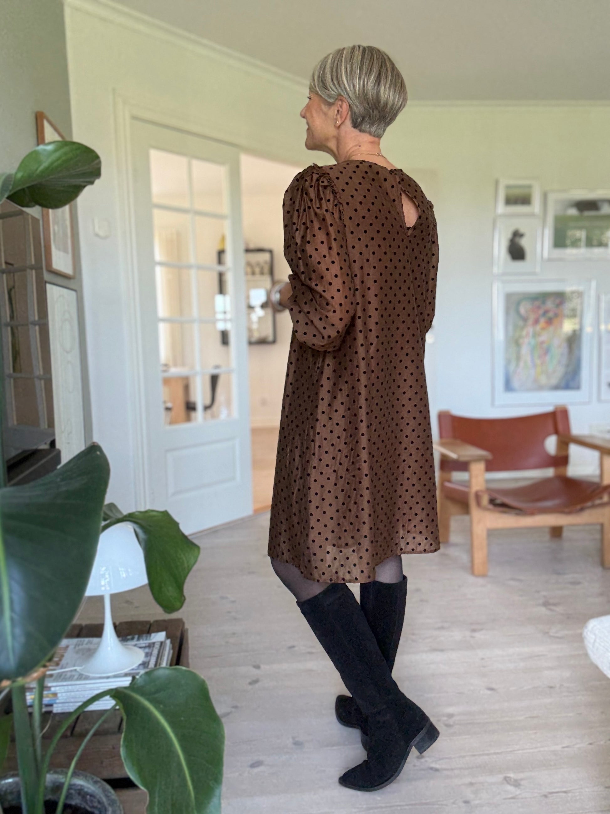 Love870-3 er en kort kjole med et prikket mønster. kjolen har en rund halsudskæring, lange ærmer med let puf ved skuldrene og en løs pasform.