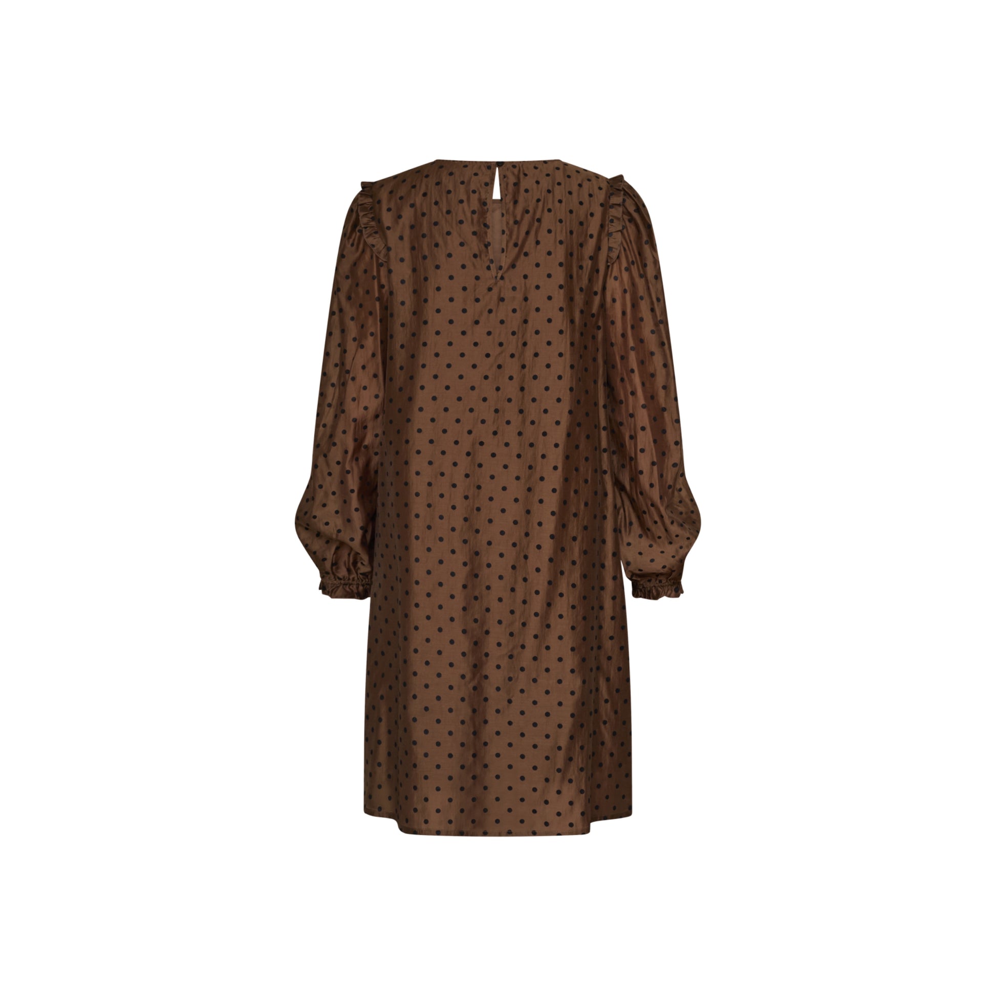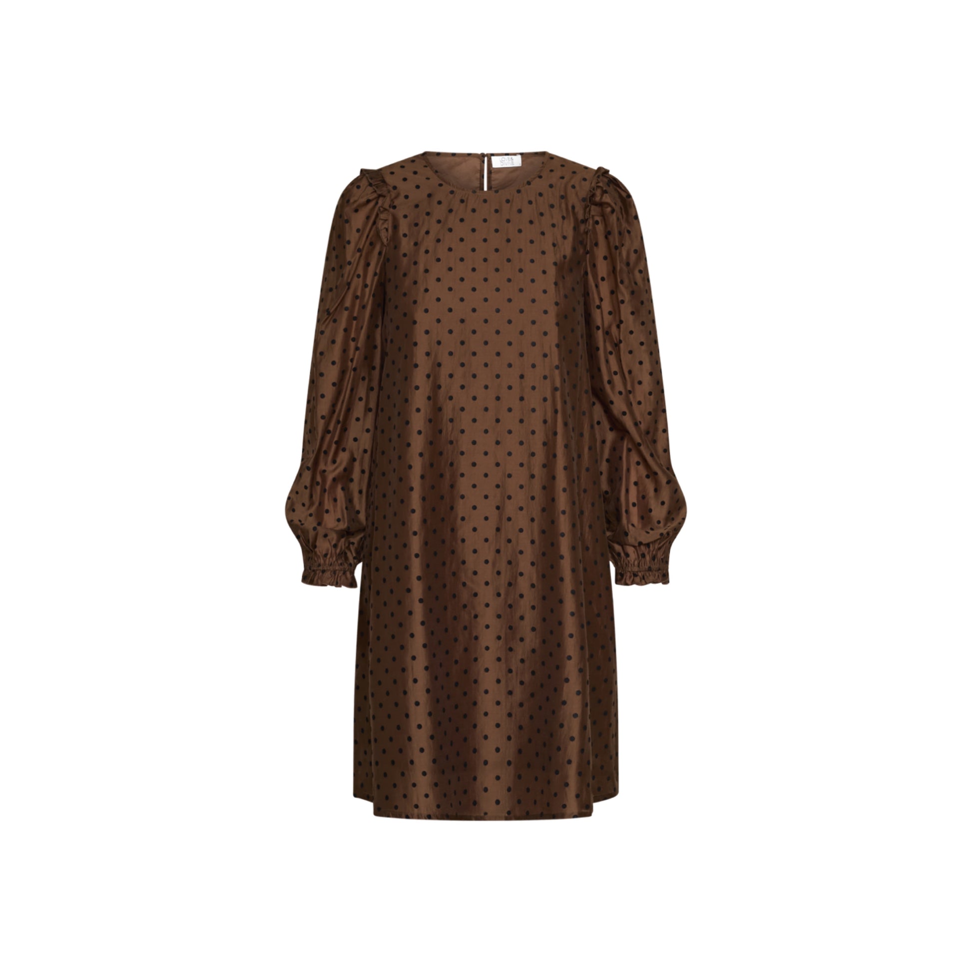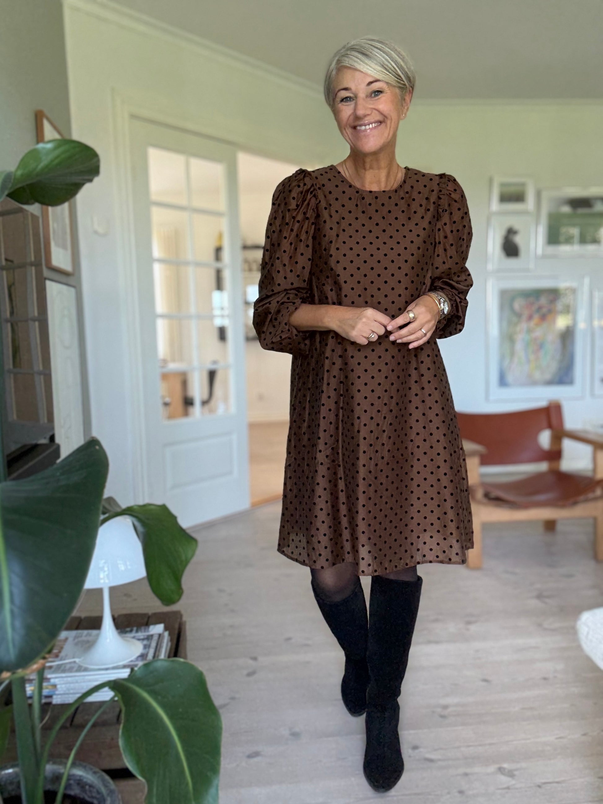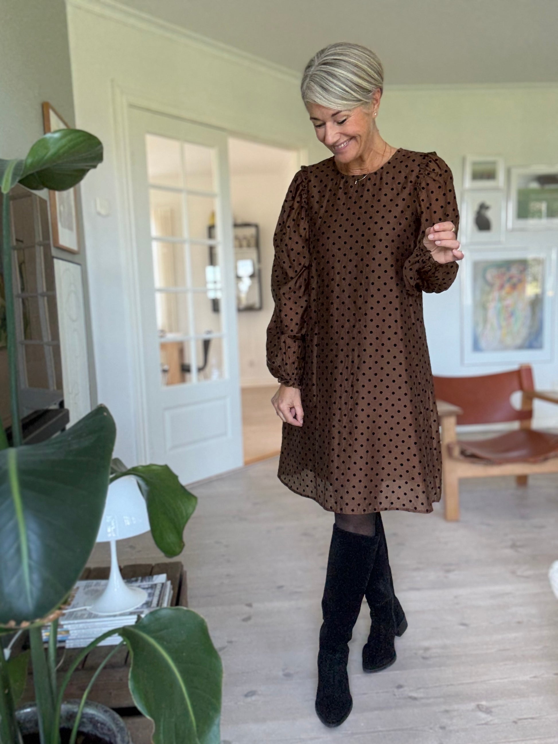 Love870-3 er en kort kjole med et prikket mønster. kjolen har en rund halsudskæring, lange ærmer med let puf ved skuldrene og en løs pasform.