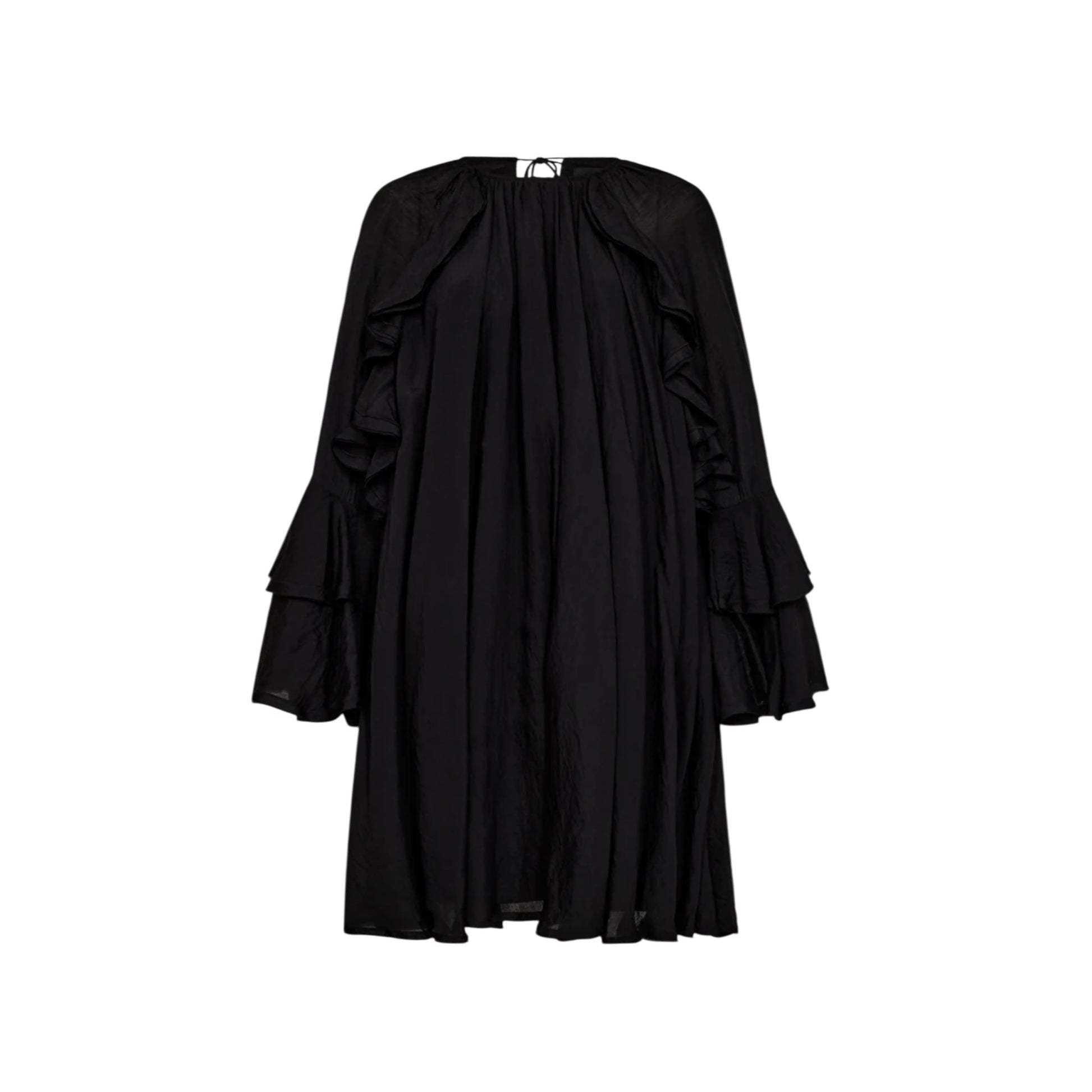 CMNORMA-DRESS er en kort kjole i en eksklusiv, transparent kvalitet med fuld foring. Kjolen har en slids med bindebånd i nakken, lange justerbare ærmer med vidde og snøre samt flæser med rå kanter, der understreger den vide pasform.