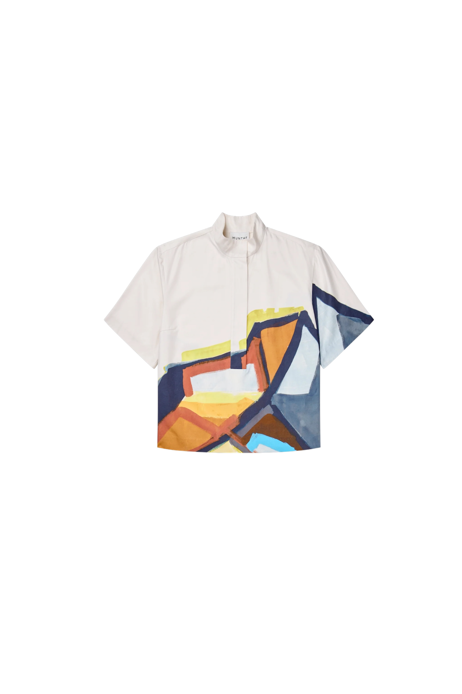 En smuk skjortebluse med et elegant kunstprint. Den er designet med korte ærmer, kan åbnes halvvejs ned og har en lille krave med en fin knaplukningsdetalje. Skjorteblusen har et løst fit.