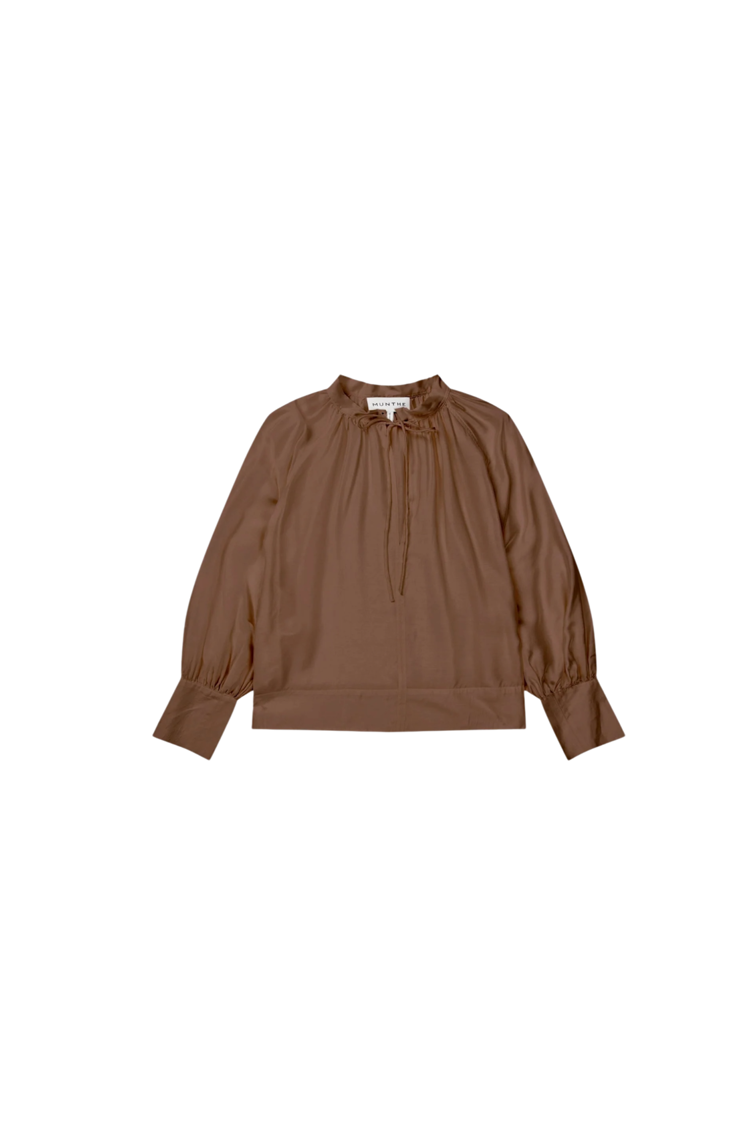 Elegant bluse, designet i let og luftig kvalitet. Blusen har lange ærmer med brede manchetter, en løs pasform samt bindebånd i halsen.
