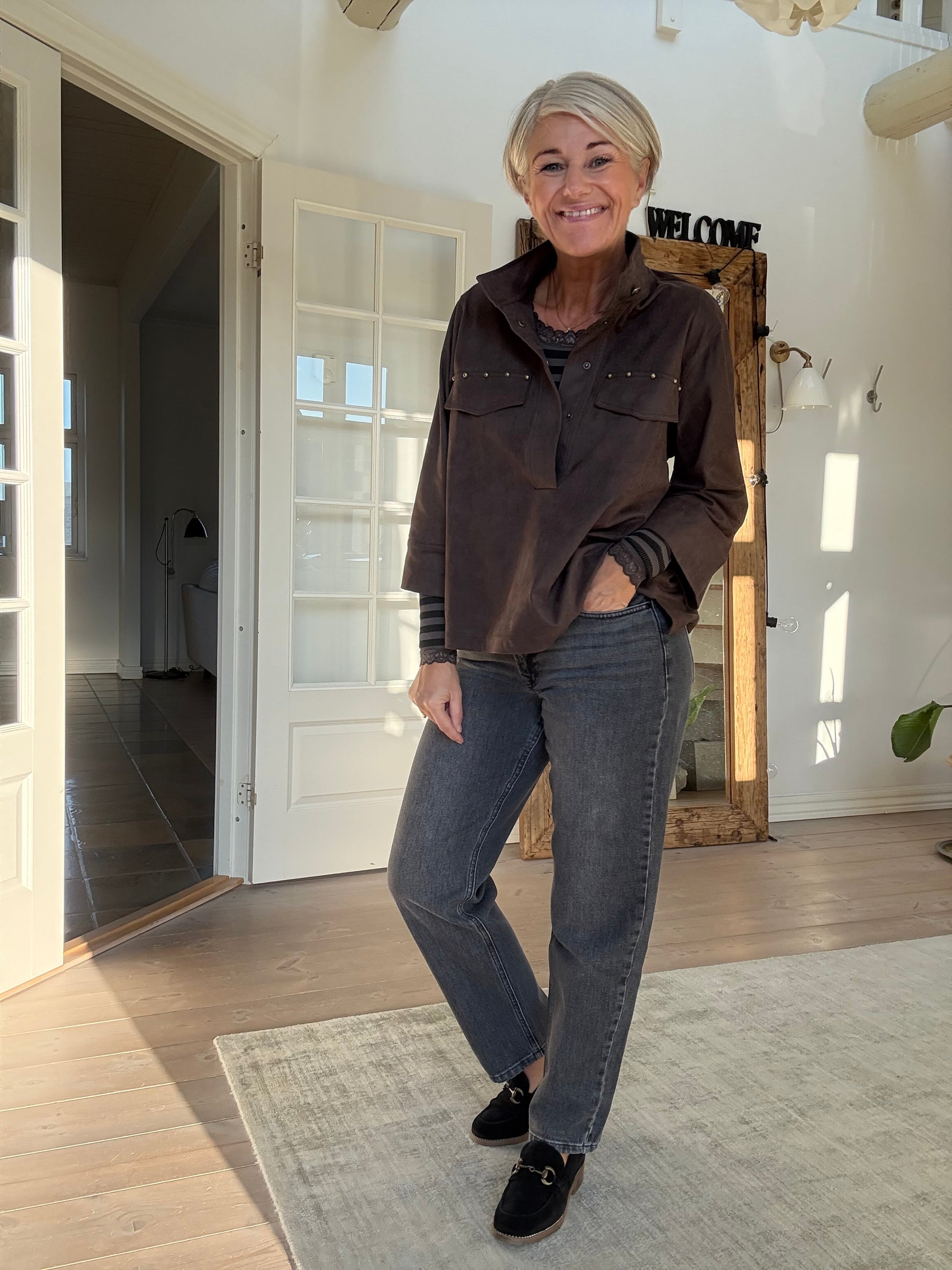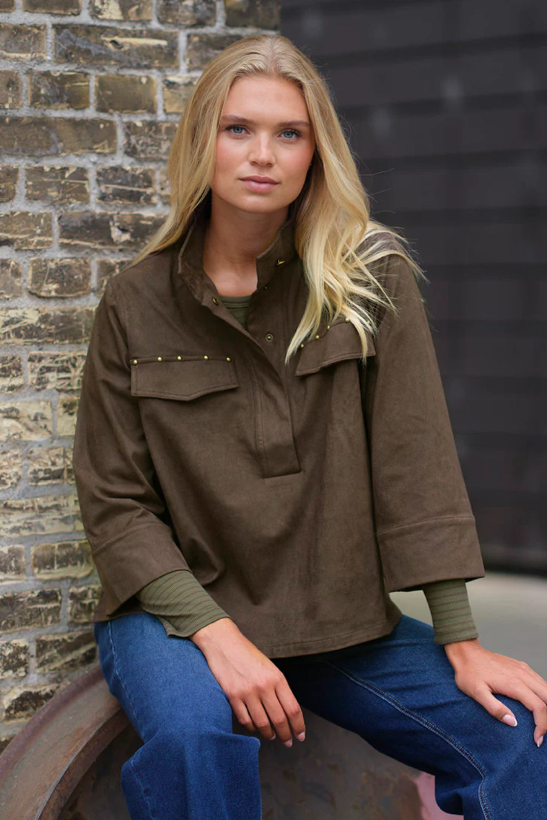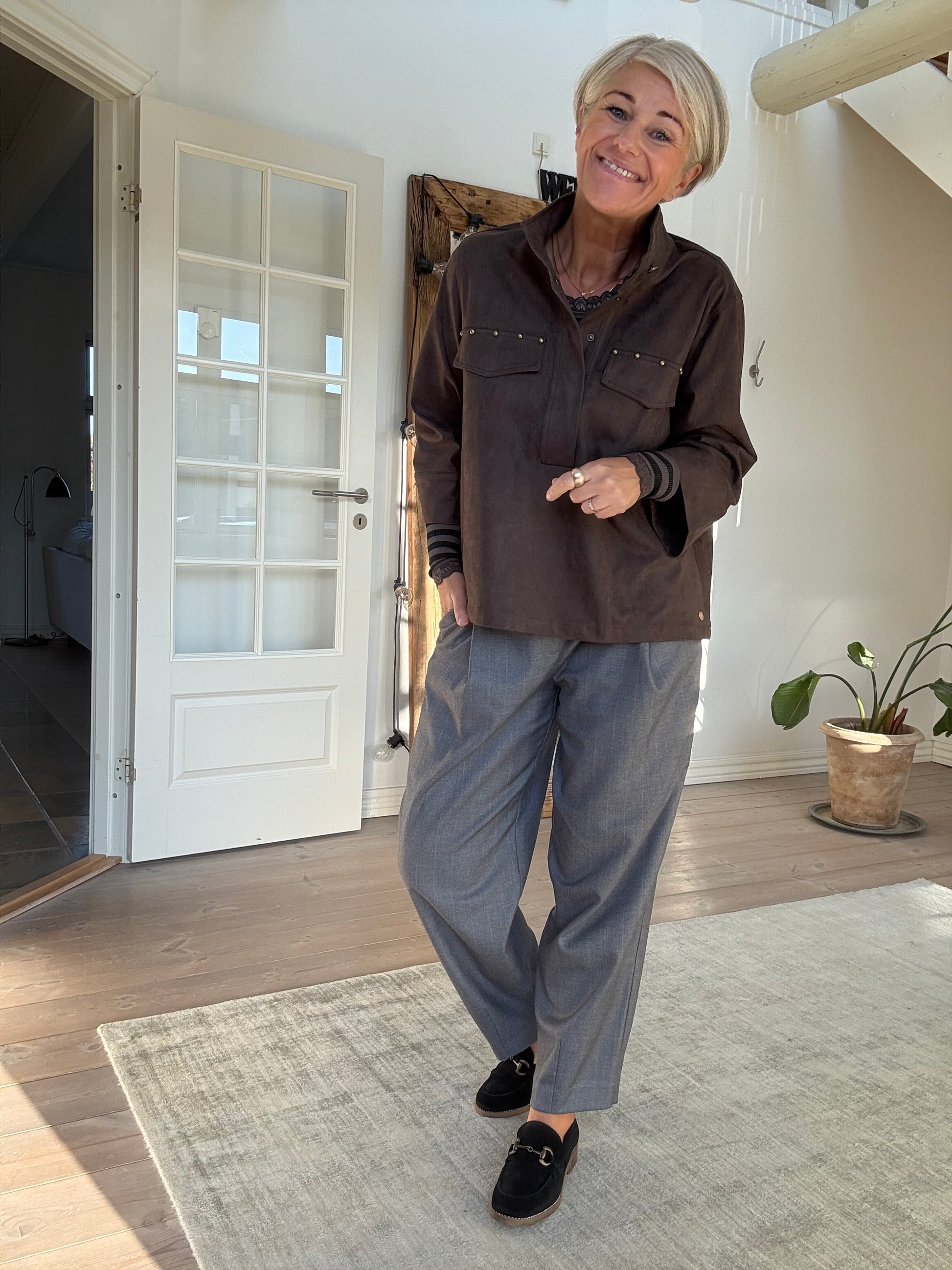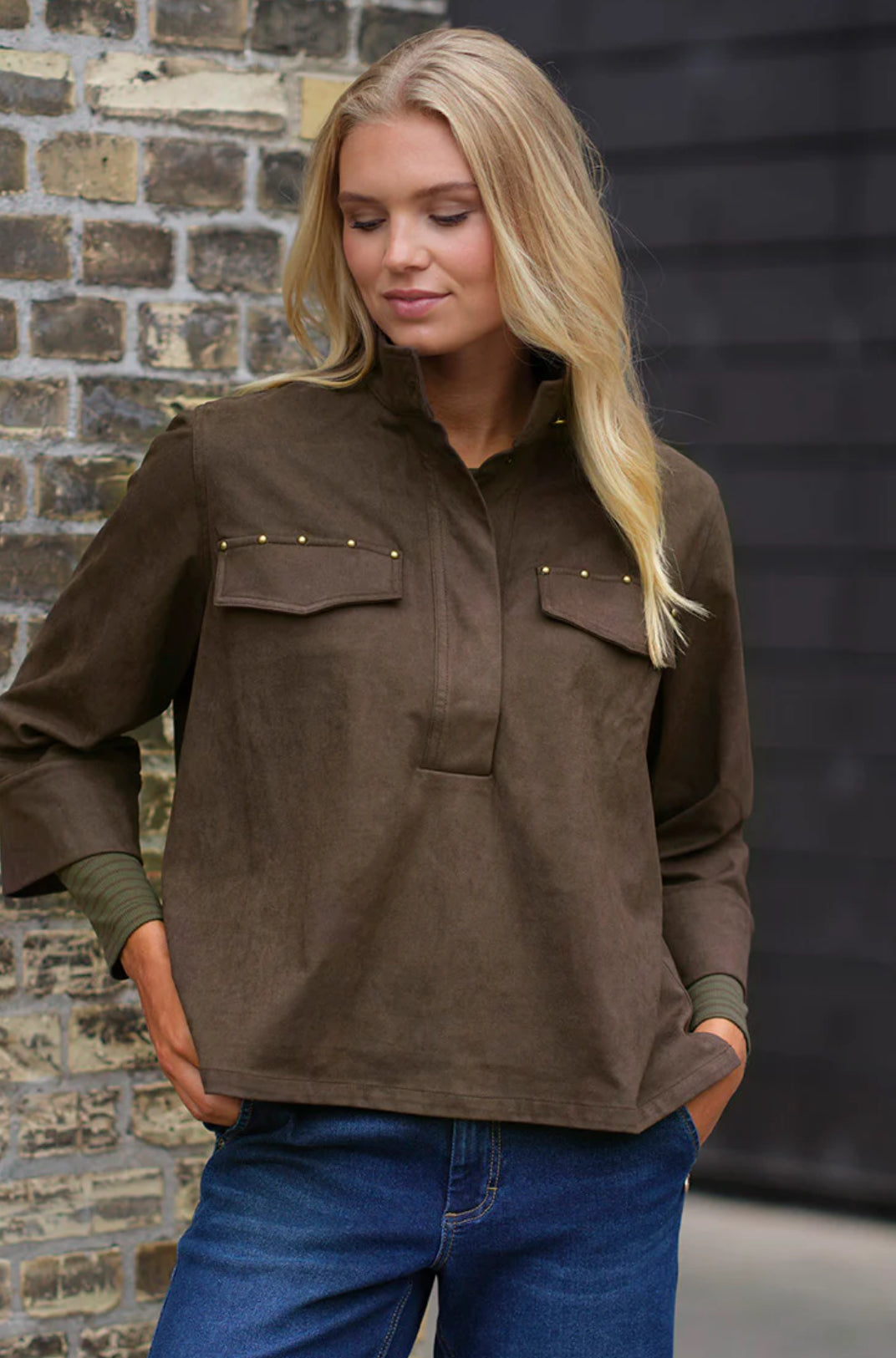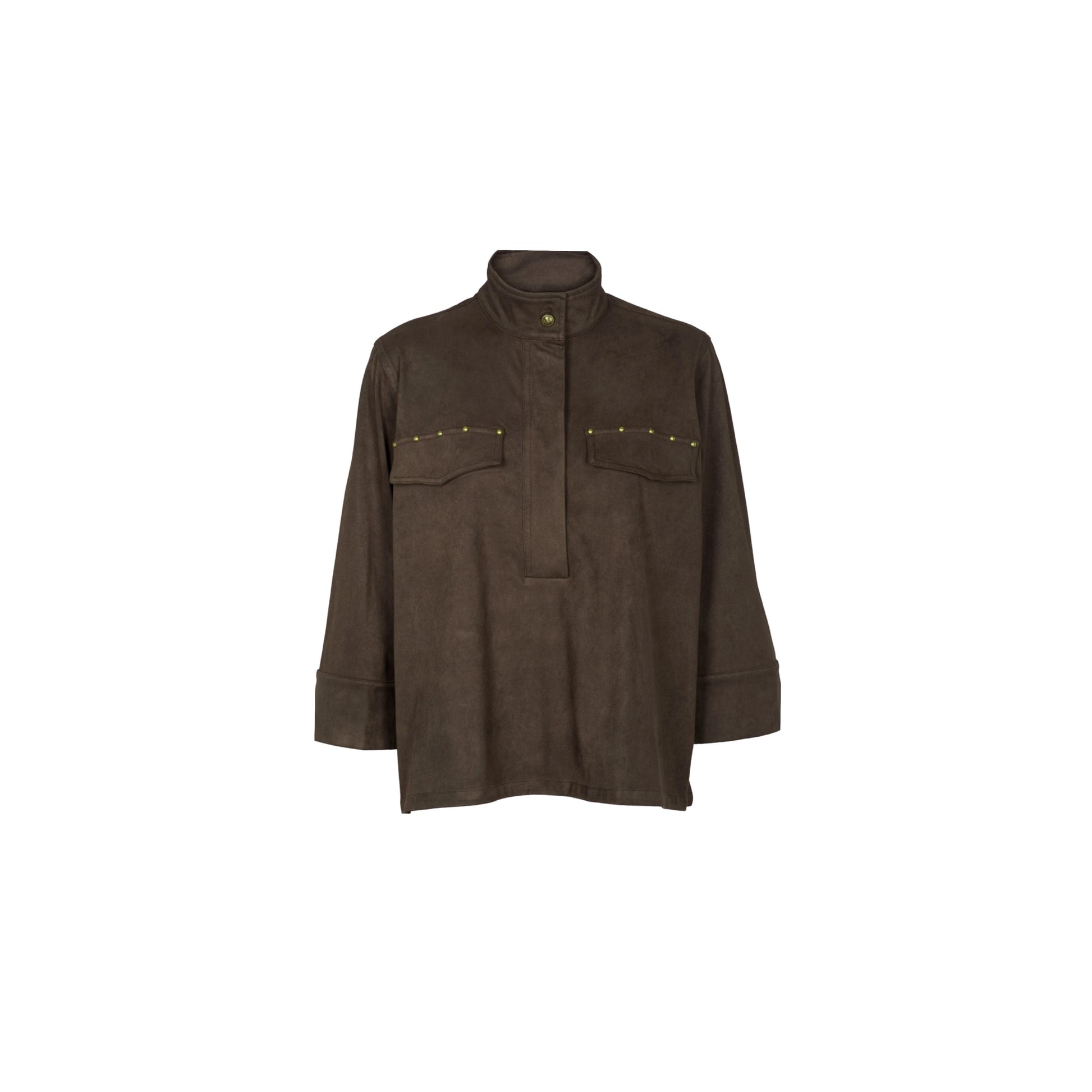 Sky Blouse i et eksklusivt ruskinds-look i en skøn brun farve. Blusen har en høj, stående krave med en knaplukning foran samt en stolpelukning med skjulte knapper. På brystet er to pynte brystlommer med dekorative nittedetaljer, der tilfører et råt twist. Blusen har en løs, boxy pasform med 3/4 lange ærmer med brede manchetter.